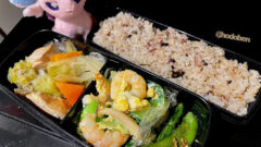- 焼いた椎茸には岩塩をふり、ささみ、うま煮、ご飯をお弁当箱に詰めて終わり。