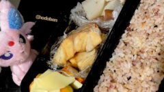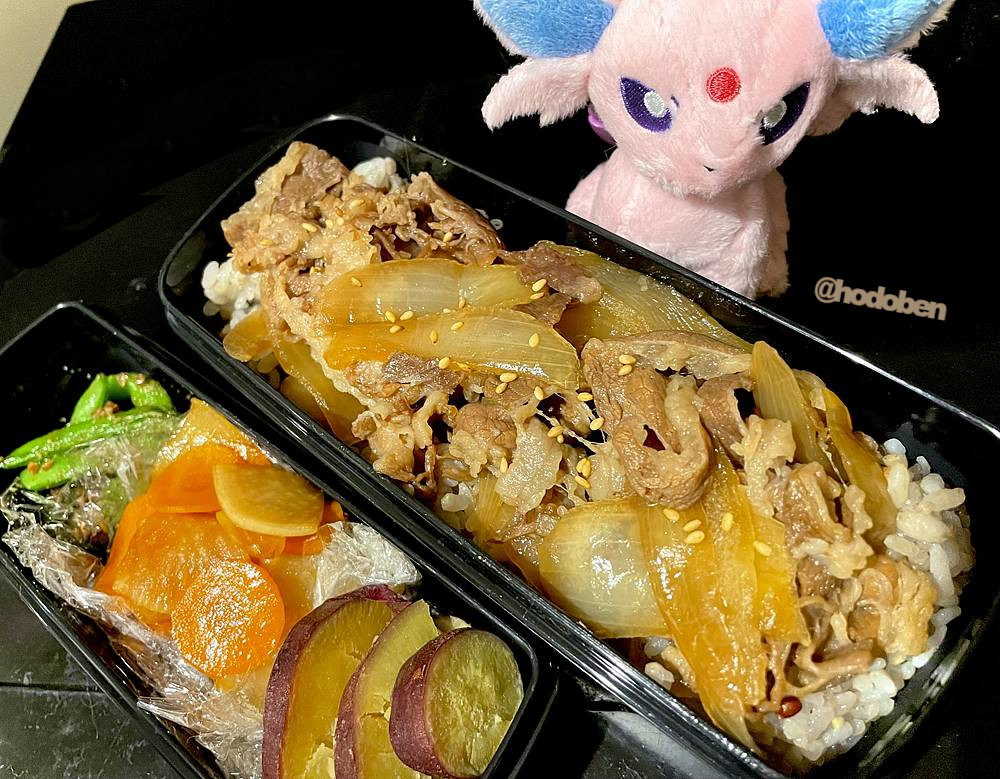 - ハンバーグ、卵とじ、甘露煮、ご飯をお弁当箱に詰めて終わり。